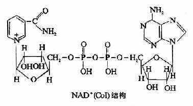 (一)尼克酰胺腺嘌呤二核苷酸(NAD+)或称辅酶I(CoI)。为体内很多脱氢酶的辅酶,是连接作用物与呼吸链的重要环节,分子中除含尼克酰胺(维生素PP)外,还含有核糖、磷酸及一分子腺苷酸(AMP),其结构如下: