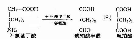 神经元胞体和突触的线粒体内含有大量的GABA转氨酶。由此就构成了GABA旁路(图7-10)。它能使α酮戊二酸经此旁路生成琥珀酸,活跃三羧酸循环,可为脑组织提供约20%的能量。谷氨酸具有兴奋作用,GABA有抑制作用,两者可共同调节神经系统的功能。临床上对于惊厥和妊娠呕吐的病人常常使用维生素B6治疗,其机理就在于提高脑组织内谷氨酸脱羧酶的活性,使GABA生成增多,增强中枢抑制作用。