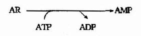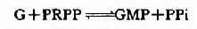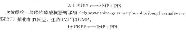 (二)补救合成途径:大多数细胞更新其核酸(尤其是RNA)过程中,要分解核酸产生核苷和游离碱基。细胞利用游离碱基或核苷重新合成相应核苷酸的过程称为补救合成(saluage pathway)。与从头合成不同,补救合成过程较简单,消耗能量亦较少。由二种特异性不同的酶参与嘌呤核苷酸的补救合成。腺嘌呤磷酸核糖转移酶(Adenine phosphoribosyl transterase,APRT)催化PRPP与腺嘌呤合成AMP: