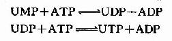 (3)闭环生成二氢乳清酸(dihydroortate):由二氢乳清酸酶(dihyolroorotase)催化氨基甲酰天冬氨酸脱水、分子内重排形成具有嘧啶环的二氢乳清酸。 (4)二氢乳清酸的氧化:由二氢乳清酸还原酶(dihydroorotate dehyolrogenase)催化,二氢乳清酸氧化生成乳清酸(orotate)。此酶需FMN和非血红素Fe2+,位于线粒体内膜的外侧面,由醌类(quinones)提供氧化能力,嘧啶合成中的其余5种酶均存在于胞液中。 (5)获得磷酸核糖:由乳清酸磷酸核糖转移酶催化乳清酸与PRPP反应,生成乳清酸核苷酸(orotidine-5′-monophosphate,OMP)。由PRPP水解供能。 (6)脱羧生成UMP:由OMP脱羧酶(omp decarboxylase)催化OMP脱羧生成UMP。 Jones等研究表明,在动物体内催化上述嘧啶合成的前三个酶,即CPS-Ⅱ,天冬氨酸氨基甲酰转移酶和二氢乳清酸酶,位于分子量约210kD的同一多肽链上,是一个多功能酶;因此更有利于以均匀的速度参与嘧啶核苷酸的合成。与此相类似,反应(5)和(6)的酶(乳清酸磷酸核糖转移酶和OMP脱羧酶)也位于同一条多肽链上。嘌呤核苷酸合成的反应(3)、(4)、(6),反应(7)和(8)及反应(10)和(11)也均为多功能酶。这些多功能酶的中间产物并不释放到介质中,而在连续的酶间移动,这种机制能加速多步反应的总速度,同时防止细胞中其它酶的破坏。 2.UTP和CTP的合成 三磷酸尿苷(UTP)的合成与三磷酸嘌呤核苷的合成相似。