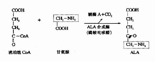 2.卟胆原的生成:线粒体生成的ALA进入胞液中,在ALA脱水酶(ALa dehydrase)的催化下,二分子ALA脱水缩合成一分子卟胆原(prophobilinogen,PBG)。ALA脱水酶由八个亚基组成,分子量为26万。为含巯基酶。
