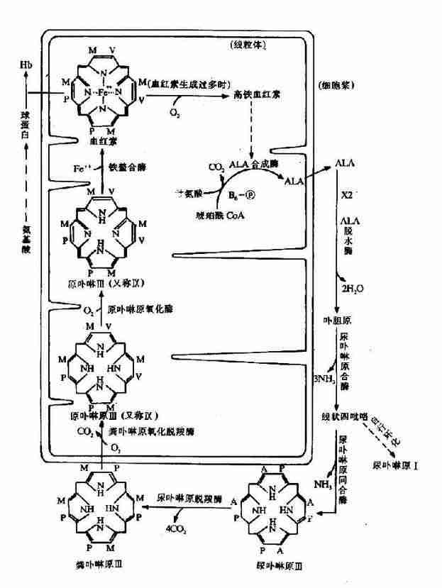 (一)血红素的合成通路(过程)血红素合成的基本原料是甘氨酸、琥珀酰辅酶A及Fe++。合成的起始和终末过程均在线粒体,而中间阶段在胞液中进行。合成过程分为如下四个步骤: 1.δ-氨基-γ-酮戊酸(δ-aminplevulinicacid,ALA)的生成:在线粒体中,首先由甘氨酸和琥珀酰辅酶A在ALA合成酶(ALa synthetase)的催化下缩合生成ALA。ALA合成酶由两个亚基组成,每个亚基分子量为60,000。其辅酶为磷酸吡哆醛。此酶为血红素合成的限速酶,受血红素的反馈抑制。