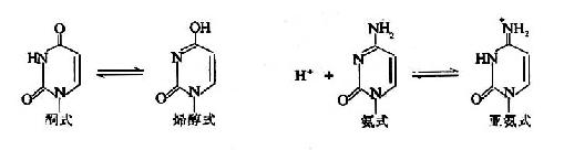 核酸中五种碱基中的酮基和氨基,均位于碱基环中氮原子的邻位,可以发生酮式一烯醇式或氨基亚氨基之间的结构互变。这种互变异构在基因的突变和生物的进化中具有重要作用。
