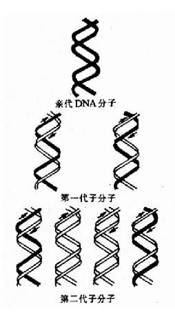 Watson和Crick在提出DNA双螺旋结构模型时即推测,DNA在复制时首先两条链之间的氢键断裂两条链分开,然后以每一条链分别做模板各自合成一条新的DNA链,这样新合成的子代DNA分子中一条链来自亲代DNA,另一条链是新合成的,这种复制方式为半保留复制。
