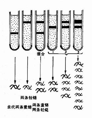 1958年Meselson和Stahl利用氮标记技术在大肠杆菌中首次证实了DNA的半保留复制,他们将大肠杆菌放在含有15N标记的NH4Cl培养基中繁殖了15代,使所有的大肠杆菌DNA被15N所标记,可以得到15N桪NA。然后将细菌转移到含有14N标记的NH4Cl培养基中进行培养,在培养不同代数时,收集细菌,裂介细胞,用氯化铯(CsCl)密度梯度离心法观察DNA所处的位置。由于15N桪NA的密度比普通DNA(14N-DNA)的密度大,在氯化铯密度梯度离心(density gradientcentrifugation)时,两种密度不同的DNA分布在不同的区带。