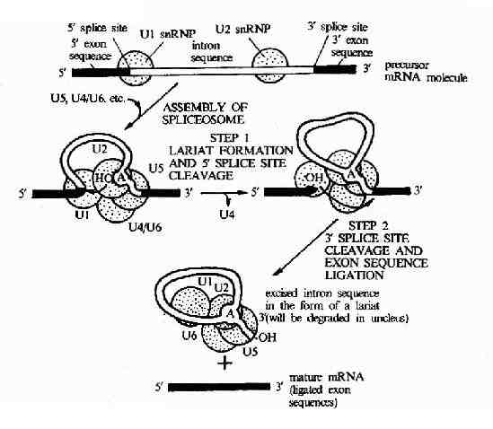 图17-13 Mechanim of mRNa splicing.Note that,for clarity,the process is shownin two stages;energy is not required for the process since transesterificationreactions are involved. 真核生物 mRNA前体在剪接过程中,还可以形成套索样的结构,在内含子序列中常有一个分支部位的腺苷酸残基,它的2’-OH可以自动攻击内含子5’端与外显子1连接的磷酸二酯键,切开了外噗子1,而腺苷酸原来已有3’,5’--磷酸二酯键相连的两个相邻的核苷酸残基,加上此3’,5’-磷酸二酯键连接后,在腺苷酸处出现了一个套索,已被切下的外显子1的3’-OH攻击内含子3’末端与外显子2之间的3’,5’-磷酸二酯键,键断裂后,内含子以套索的形式被节下来,此时外显子1和外显子2可以连接起来(图17-13)。 不论拼接过程如何,拼接必须极为精确,否则会导致遗传信息传递障碍,合成的蛋白质可能丧失其正常的功能。我国南方广大地区是β-地中海贫血的高发区,这是由于β-珠蛋白链的合成受到部分或完全抑制所引起的一种血红蛋白病。实验表明β-珠蛋白基因元1中核苷酸的点突变改变了正常拼接部位的碱基顺序,结果造成错误部位的拼接。加工成熟的mRNA虽能翻译,但产物不是正常的β-珠蛋白,结果引起血红蛋白级结构和功能的改变。