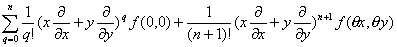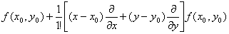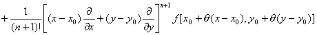 [泰勒公式]  假定在某一点(x0,y0)的邻域D内二元函数f(x,y)有直到n+1阶为止的一切连续偏导数.分别给xy以改变量hk,使连结点(x0,y0)(x0+h,y0+k)的直线段不越出D,那末f (x,y)D内可表成形式: