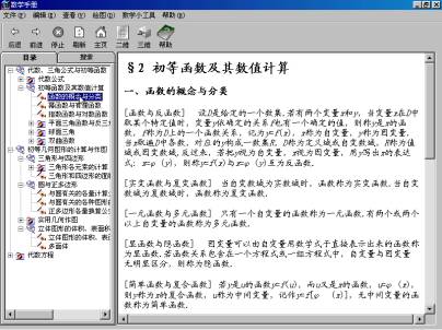 进入数学手册后,在窗口的左侧会出现手册内容的目录栏,用鼠标单 击各目录名称前面的加号“+”或者直接双击目录名称,可以显示该目录 下的次级目录和相应内容。用鼠标单击目录下的内容名称,在右侧的窗口 中就可以相应的内容,如图3-1所示。